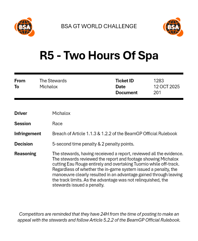 | 2025-12-06 | SC | 25 S4 W14 GT World Challenge (Round 11) | P5 |