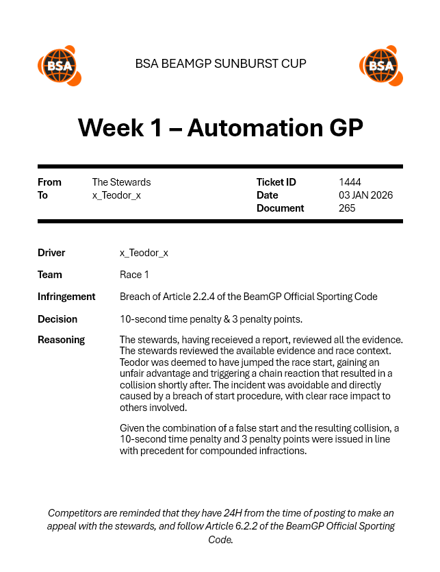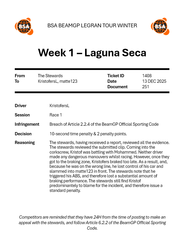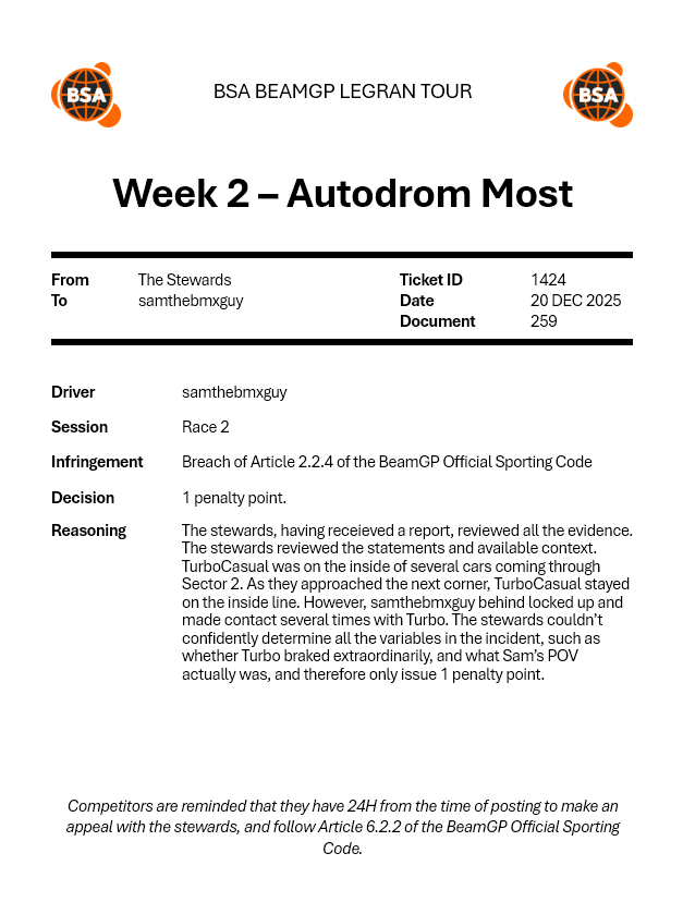 Breach of Article 2.2.5 // 10-second time penalty & 2 penalty points.